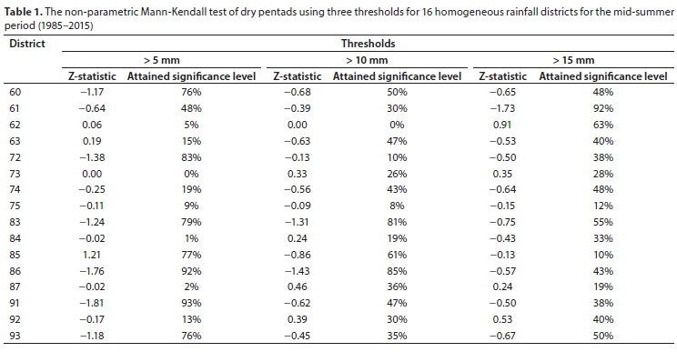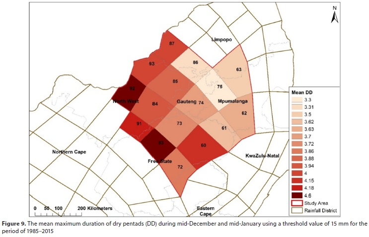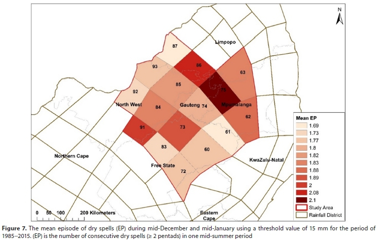In this study, a dry spell is defined as a period of 5 days (a pentad) during which rainfall totals are less than predefined thresholds. Three thresholds of 5 mm, 10 mm, and 15 mm total rainfall for a pentad were used for the analysis of dry spells. This study aims to perform a detailed spatial and temporal analysis on the occurrence of the mid-summer dry spells (MSD) based on magnitude, length and time of occurrence in the summer rainfall region of South Africa.