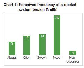 As depicted in Chart 1, this study suggests that the e-docket system in the stations under review may be vulnerable to security breaches. This was evidenced by nine respondents (14%) who indicated that the e-docket system always suffers a security breach, thirteen (20%) who indicated that it occurs often, and fourteen (21%) out of 65 survey respondents who indicated that a security breach seldom occurred. Twenty-six respondents (40%) - a considerable number - said that the e-docket system was never breached. All responses considered, this implies a low technological readiness for secure electronic records management in the SAPS.