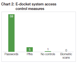 Access control is another important element of security in electronic records systems. Chart 2 displays the results when asking respondents about the access control measures employed for the e-docket system.