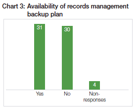 Respondents who answered 'Yes' were asked an open-ended follow-up question about what that consisted of. Six respondents indicated that there was a manual system as a backup plan in case the e-docket system failed. However, this is inadequate in the case of a disaster, unless copies of current records are kept off-site. Many organisations migrate to electronic records management due to the many limitations of manual systems. If these stations rely on on-site manual backup, they may well be susceptible to security risks of disaster and loss of electronic records.