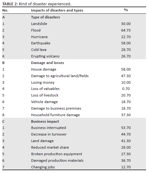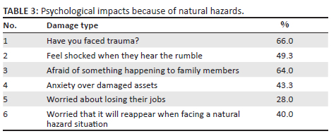 In Table 2, similar incidents were also experienced by victims of other natural hazards such as earthquakes, volcanic eruptions, volcanic ash, rain, landslides, hurricanes and more (Table 2). As a result of these various types of natural hazards, the community has suffered losses on both small and large scales. The extent of damage caused by these natural hazards varied: 38% reported severe damage, 11.3% reported moderate damage and 27.3% reported minor damage.