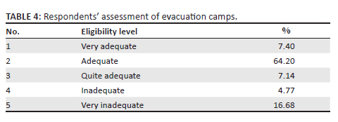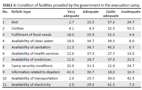 It is reported in Table 4 that most respondents admitted they generally received relatively good treatment during their stay in the evacuation camp. Eight per cent of children experienced problems continuing their education. However, some respondents reported that their belongings were threatened if they were lost or damaged in the refugee camp (16.6%). Locations and evacuation camps for disaster victims are usually provided by various parties, including village or sub-district officials, district officials, provincial and central government, and private entities. The number of respondents who stated that their needs were adequately met was reasonable because various facilities were available in the evacuation camps, such as sanitation, kitchens, places to rest and sleeping arrangements.