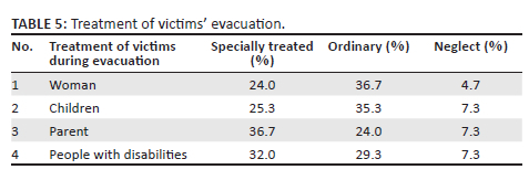 The data presented in Table 7 show that respondents indicated a significant focus on relief efforts for disabled individuals (54.7%) and vulnerable groups (53.3%). It is noteworthy that these relief efforts do not distinguish between social and cultural identities, such as the gender of the victim (75.3%), ethnicity and race (84.6%) and religion (86.6%). This indicates that in disaster rescue, particularly in relief efforts, the principles of justice and non-discrimination are upheld, ensuring that all individuals, regardless of their ethnic, racial or religious backgrounds, receive relatively equal opportunities and treatment.