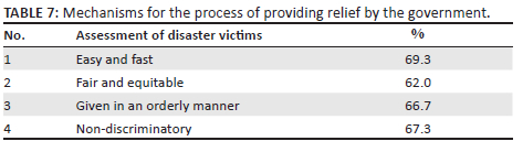 As shown in Table 6, respondents indicate that the availability of medicines and quality health services is essential, particularly for victims of natural hazards who are injured or require medical treatment. Victims of flood disasters, for example, often experience subsequent health issues such as dysentery, diarrhoea and skin diseases. It is crucial to establish mechanisms for managing disaster victims to mitigate further impacts and prevent loss of life because of natural hazards. This process involves various parties, including local government officials, village and sub-district officials, sub-district and district governments, stakeholders and community members (Arifin et al. 2021; Pratama & Nurmandi 2020). Involving diverse stakeholders is vital to ensure that assistance is provided quickly, fairly and equitably while upholding values of togetherness and eliminating discriminatory behaviour. A relief delivery mechanism based on these principles greatly enhances the effectiveness and efficiency of the aid distribution process.