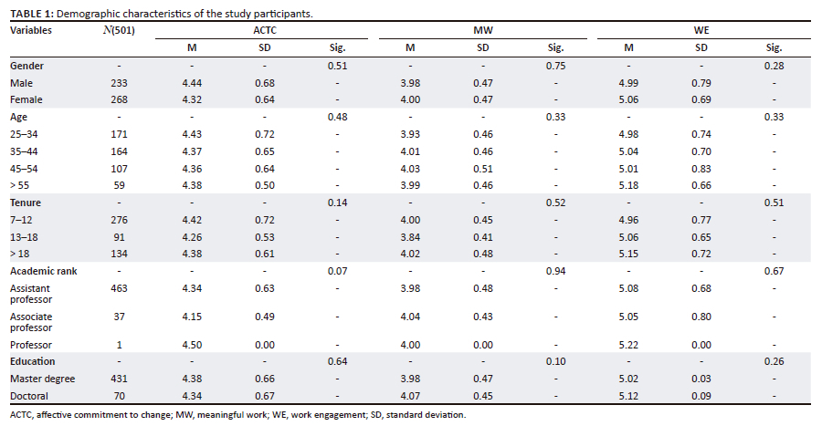 The data obtained were analysed using t-test and ANOVA. The result showed that the demographic factors did not have any impact on affective commitment to change, meaningful work and work engagement as indicated in Table 1.