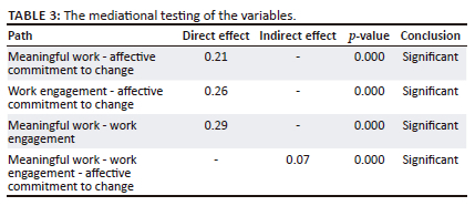 Figure 2 and Table 3 highlight the fact that meaningful work had a significant effect on both work engagement and affective commitment to change. Moreover, work engagement displayed a significant effect to affective commitment to change. It was also noted that the relationship between meaningful work and affective commitment to change was partly mediated by work engagement. This indicated that hypotheses 1, 2, 3 and 4 were substantiated.