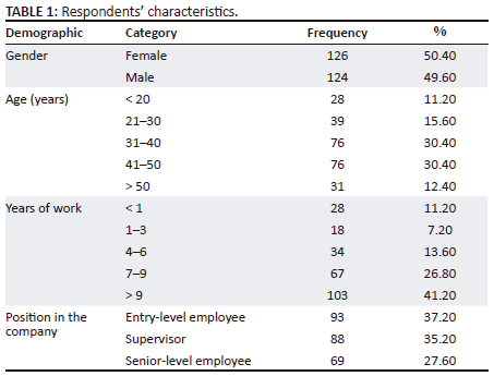 This research involved 250 respondents consisting of 50.40% women and 49.60% men, showing an almost equal gender distribution. Based on age, the majority of respondents were aged 31-50 years (60.80%), while the remainder were spread across the age groups under 20 years (11.20%) and over 50 years (12.40%). In terms of length of work, most respondents had work experience of more than 9 years (41.20%), followed by the group with work experience of 7-9 years (26.80%). For positions in companies, the majority of respondents work at the entry level (37.20%), followed by supervisors (35.20%) and senior level (27.60%). These data provide an overview of respondent diversity that is relevant to organisational structures in the food and beverage industry (Table 1).