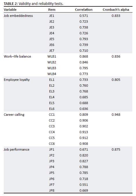 Data were collected through a self-administered online questionnaire that comprised two sections: demographic background and measurement items related to the study variables. Each construct was measured using a 5-point Likert scale ranging from 1 ('Strongly Disagree') to 5 ('Strongly Agree'). Work-life balance was measured using four items adapted from Agha et al. (2017), covering both time-based and strain-based balance (e.g. 'I am able to balance the demands of my work and personal life'). Job performance was measured using eight items from Griffin et al. (2007) and Rezvani et al. (2018), including task performance and contextual performance (e.g. 'I fulfil the responsibilities specified in my job description'). Employee loyalty was measured using six items from Mehta et al. (2010), focusing on affective and behavioural loyalty (e.g. 'I am willing to put in extra effort for the organisation's success'). Career calling was measured using six items adapted from Wu et al. (2018), assessing one's sense of purpose and perceived meaningfulness at work (e.g. 'I see my work as a calling rather than just a job'). Job embeddedness (JE) was measured using seven items from Crossley et al. (2007) and Qian et al. (2022), encompassing fit, links and sacrifice dimensions (e.g. 'I feel personally connected to the people at my workplace').