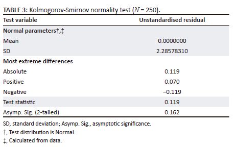 The results of the normality test using the Kolmogorov-Smirnov method show that the asymptotic significance (2-tailed) is 0.162, which is greater than the significance limit of 0.05 (Table 3). This shows that the residual data are normally distributed. In addition, the statistical test value (test statistic) is 0.119 with an average parameter of 0.000 and a standard deviation of 2.285, indicating minimal deviation from the normal distribution. Thus, the normality assumption for regression analysis has been met, so that the analysis results can be relied on for further interpretation (Hair et al., 2014).