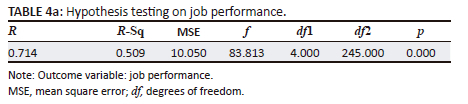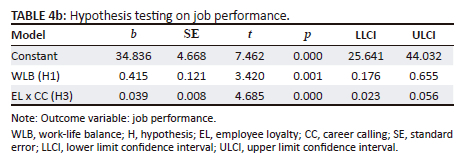 The results of the hypothesis test (Table 4a and Table 4b) show that the predictive model for JP is significant with F (4,245) = 83.813, p < 0.001, and the contribution of the independent variable (WLB) to JP reaches R2 = 0.509, which means the model explains 50.9% variance in JP. These results show quite high predictive power. Specifically, WLB has a significant direct influence on JP with a regression coefficient b = 0.415 (t = 3.420, p = 0.001, lower limit confidence interval [LLCI] = 0.176, upper limit confidence interval [ULCI] = 0.655). This supports the H1 that WLB has a direct positive influence on JP.