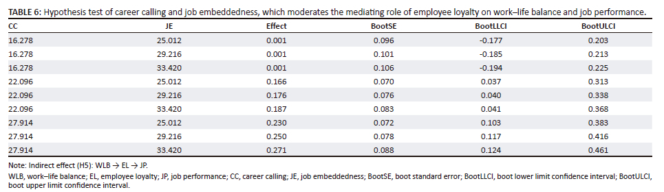H5: Job embeddedness and career calling simultaneously moderate the mediating influence from work-life balance to job performance through employee loyalty.