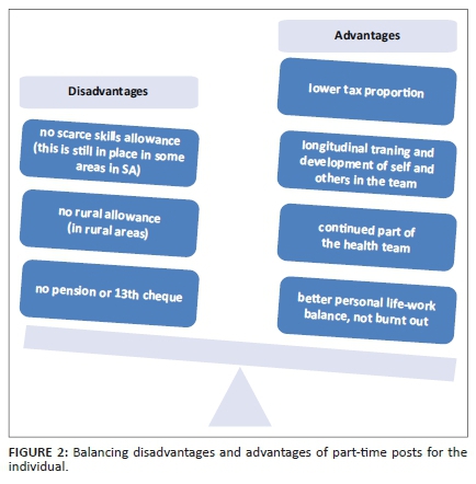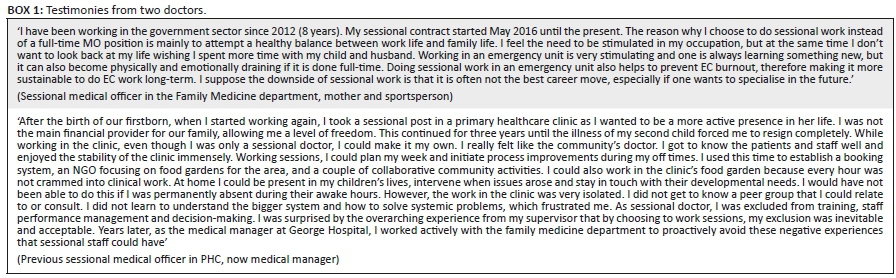 Because they work less hours, these doctors often come to work more energised, focused and willing to take on other roles like student, interns and nurses' teaching, clinical and corporate governance and managerial roles. Employing MOs in part-time posts has created stability and continuity in the health team. We have generated a cohort of young professionals who are not burnt out, are eager to serve, give care with empathy and have emotional resilience to also invest in the training of others. The advantage of having fully engaged clinicians was initially underestimated by the consultants. Most of these doctors previously occupied full-time posts and subsequently developed insight in the difference in quality of service delivery which they were providing. Put differently, doctors did not realise how burnt-out they were till the moment of retrospection, and this has helped in their developing a better sense of loyalty to the hospital. The clinical department has not experienced the high turnover of posts that was expected. The hospital has retained many of these doctors for many years now. The flexitime posts have also become sought after by other clinical departments, hoping to find a more balanced work-life in rural public practice within a state hospital or PHC clinic. The box below gives the testimonies from two doctors that illustrate these points.