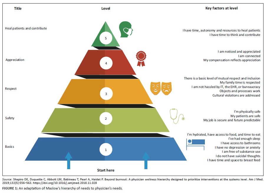 Physician burnout has been the topic of multiple international publications and conversations.11 Burnout, a syndrome of emotional exhaustion and depersonalisation, resulting from the workplace, has been reported to affect 54.4% of doctors in the USA between 2011 and 2014.12 Exposure to clinical work hours demonstrates a dose effect with burnout, suggesting cause and effect.12 The situation is similar in SA, with studies in the urban and rural areas in Cape Town,13,14 the Orange Free State15 and at Wits University16 indicating 80% of registrars suffered from burnout. An adaptation of Maslow's hierarchy of needs to physicians' needs indicates that healing of patients only becomes important after other basic needs are fulfilled (See Figure 1).17