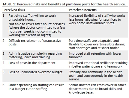TAKING A RISK: George Hospital, a large regional training hospital in a rural district, converted some full-time medical officer posts to part-time posts. This was in response to doctors' requests for more flexible work options, often after returning from maternity leave or in response to burnout. Perceived risks revolved around institutional resource security and that part-time post vacancies would be difficult to fill.