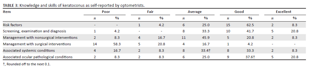 Table 3 shows the practitioners' self-reported perceptions of their knowledge and skills regarding diagnosis and management of KC. A total of 15 (62.5%) optometrists reported having good knowledge and skills of the risk factors for KC; 10 (41.7%) had good knowledge and skills of screening, examination and diagnosis of KC; 9 (37.5%) had good knowledge and skills of ocular pathological conditions; and 8 (33.3%) had good knowledge of the associated systemic conditions. The majority (58.3%) reported having poor knowledge of surgical interventions of KC.