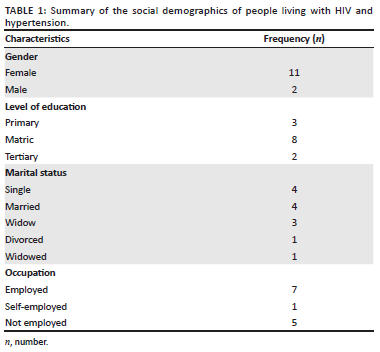 A total of 31 IDIs were conducted. A total of 13 patient participants with HIV and HTN participated and the majority were female (11/13); amongst these 10/13 had attended school at least up to grade 12 level. The mean age was 43.9 years with a standard deviation of 7 years. The participants had well-established conditions with an average duration of 10.5 years living with HIV and 5.8 years living with HTN. The number of participants in each of the single and married categories was 4/13. Most of the patients (8/13) had at least some type of employment (see Table 1).