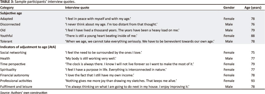 Considering that the first objective of this investigation was to explore older adults' SA and indicators of AtA, results from the content analysis suggested five emergent categories for SA, namely, (a) 'adapted', (b) 'disconnected', (c) 'old', (d) 'youthful' and (e) 'tolerant' (see Table 2). These are in line with our conceptual framework in which SA is a multidimensional construct, assessing facets such as felt age and perceived age (Kotter-Grühn & Hess 2012:563).