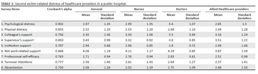 The participants' second victim experience, related distress and support were categorised based on the following: nurses, doctors and allied healthcare providers, which are captured in Table 1.
