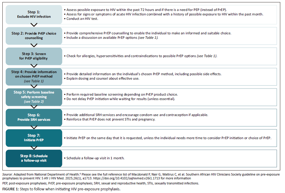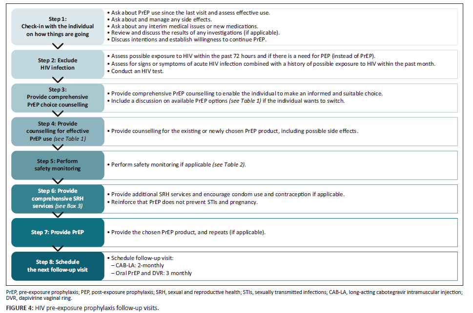 PrEP should be offered as part of an integrated sexual and reproductive health (SRH) package that includes options for HIV prevention to all individuals with a negative HIV test result, and who are likely to be exposed to HIV or who request PrEP. Figure 1 details how to initiate PrEP.