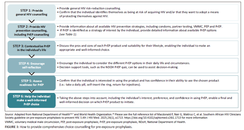 Table 1 details available PrEP options in the South African setting, and Table 2 details appropriate safety screening and monitoring.