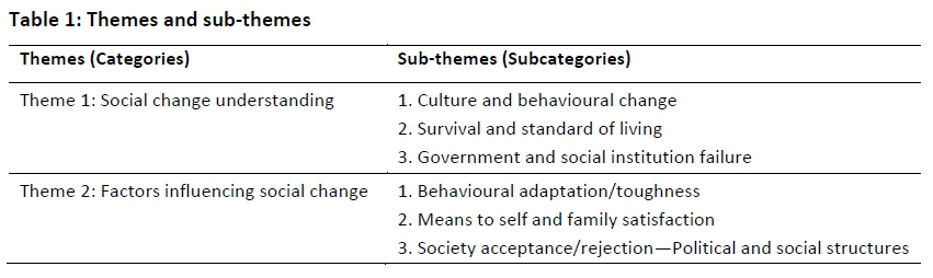 Research questions and the reviewed literature were used to provide guidelines for data analysis (see Marshall & Rossman, 1999). Further to this, Marshall and Rossman's (1999) six phases in the analytic procedures were utilised, namely, organising the data, generating categories, themes, and patterns, coding the data, testing the emergent understandings, searching for alternative explanations, and writing the report. We analysed the data by looking at key words such as description or understanding of social change and the factors that affect social change. Two main themes emerged as we coded and interpreted interview transcripts-social change understanding, and factors influencing social change. Both themes relate mainly to the research questions that this article seeks to answer and, thus, served as the anchor of the findings and discussion as will be seen in the next section. With reference to the study's limitation, we divulge that this article was not aimed at generalisations. Therefore, the findings cannot be generalised following its small sample. This suggests that the findings are limited to the research participants; nevertheless, it could serve as a useful insight or springboard for larger and future studies of a similar nature.