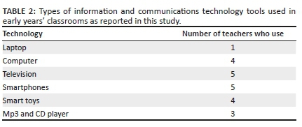 The results illustrated in Table 2 indicated that five of the teachers use television and smartphones as ICT tools for teaching young children in early childhood classroom, four use computers and smart toys, three use Mp3 and CD players and laptop is used by one of the teacher.