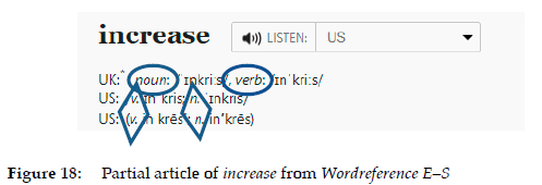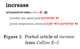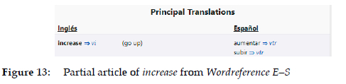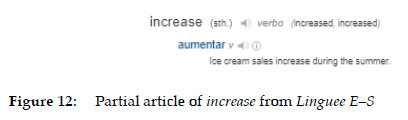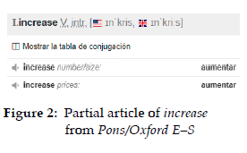 This can be illustrated with a very simplified example. If we look for information about the word increase (which, in an attempt to simplify the question, will be discussed here exclusively as a verb) in a bilingual English-Spanish dictionary, we do not generally find entries in modern dictionaries with the following information: