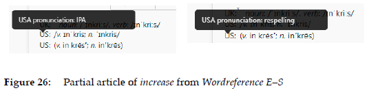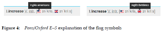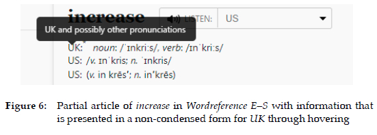 (b) In the example in Figure 4, the explanations "American English" and "British English" are visible by hovering the cursor over the flags, as previously shown. The flag symbols are, therefore, items that are presented in a condensed form, and which become uncondensed through a textual level that is accessed by hovering the cursor over them. Another example of un-condensation that is visible by hovering the cursor over a condensed form in the initial level can be found in Wordreference E-S: