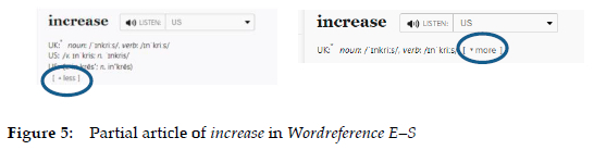 The example in Figure 1 presents "intransitive verb" without an abbreviation (and therefore, without condensation), whereas the example in Figure 2 shows "V. intr.", which is an equivalent propositional content to the previous one, but which is presented here in its abbreviated (condensed) form. In any case, it is necessary to consider that all the dictionary articles, as they are currently known and according to the basic conventions of the object that we call a dictionary, always present a certain degree of condensation. Even if all the components in the lexicographic article were presented in their uncondensed form - which is not at all common - we always find at least some omissions: the components are not linked to each other through the procedures of natural languages, as can be seen in Figures 1 and 2. There are no sequences such as "an equivalent for increase in Spanish is "the meaning of increase is "increase is an intransitive verb ..." or "increase, as an intransitive verb, means ...". No, as observed, the corresponding data are formalized through different procedures that are typical of dictionaries and that allow us to identify them as such. Moreover, the process that we call lemmatization is a type of condensation that is typical of lexicography and characterizes it. For example, in all the dictionaries in which the word is included, increase is a lemma sign that, through a process of selection - and, consequently, the omission of all other potential elements - represents the entire paradigm of the verb.4