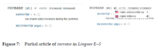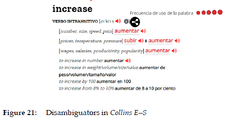 The same procedure can be seen in Pons/Oxford E-S (Figure 2) and in Longman E-S. In this last case, this does not appear in the English-Spanish section, but in the Spanish-English one (Figure 22), which may be due to the didactic approach of this dictionary.