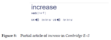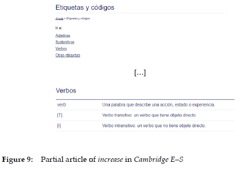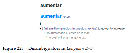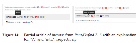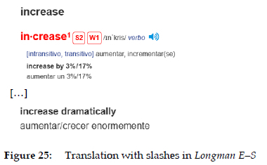 Included here are all the items that refer to different classes of words, syntax (such as transitive/intransitive), and morphological items (e.g. conjugation models). In Collins E-S, Cambridge G. E-S, and Longman E-S, we can find information presented in a non-condensed form regarding the fact that increase is a verb, and also regarding its transitive or intransitive nature. Figure 1 showed the example from Collins E-S ("intransitive verb"). Figure 10 shows two more examples.