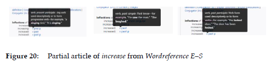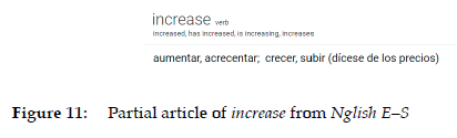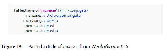The classical verb conjugation forms (in this case increased, has increased, is increasing and increases, in that order) can also be found in Nglish E-S (Figure 11), although without any hyperlink, explanation or additional information.