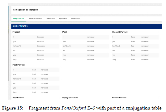 The forms of inclusion on the verb conjugation also show that different decisions have been made. Pons/Oxford E-S also presents a hyperlink to a conjugation table that provides extensive information related to the article through a process similar to referencing (Figure 15).