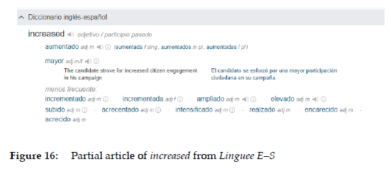 In Linguee E-S (Figures 7 and 12), next to the word "verbo" can be found "(increased, increased)", which, as users may deduce, are the forms of the past simple and the participle (in no specific order). By clicking on "increased" more information is available (Figure 16):