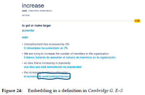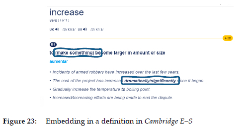 This example shows an embedding mechanism which is not uncommon in definitions, but which is less frequent within examples. The sentence "to (make something) become larger in amount or size" embeds two definitions into one: "to become larger in amount or size" and "to make something become larger in amount or size". A similar procedure can be found in the second example: "The cost of the project has increased dramatically/significantly since it began". As we know, the slash replaces "or" in natural language. The same type of formaliza-tion can be found in Collins E-S (Figure 21: "to increase in weight/volume/ size/value ...") or Cambridge G. E-S (Figure 24).
