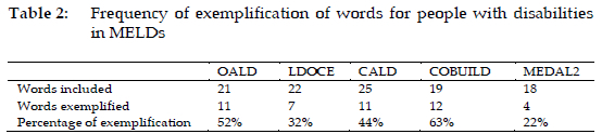 Learner's dictionaries differ from each other in the number of exemplified words for people with disabilities and the number of included examples. As Table 1 shows, COBUILD contains the highest number of exemplified words (12), followed by CALD and OALD, each with 11. LDOCE includes fewer exemplified words (7), while MEDAL2, the only print edition among the five dictionaries, has the fewest, with only four.