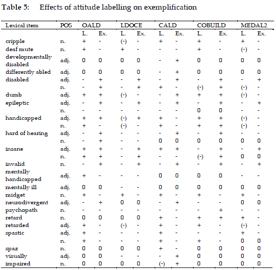 In order to investigate the effects of attitude labelling on the exemplification of sensitive words for people with disabilities in the "Big Five", I examined the exemplification of the words labelled as having negative connotations by means of usage labels (e.g. "disapproval", "disapproving", "impolite", "not polite", "offensive", "rude", and "taboo") and other devices like definitions and usage notes. The results are tabulated in Table 5. In the Table, "L." means labelling, whereas "Ex" indicates exemplification. In the "L." column, a plus sign means that the word's offensiveness is marked by an attitude label in the dictionary. A minus sign shows that no label is provided for the word. A minus sign placed within brackets indicates that the word's offensiveness is marked by other devices such as definitions or usage notes. A zero means that the word or the relevant disability sense is not included in the dictionary.