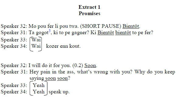 It is particularly noteworthy that the shift to a swear word is preceded by the reduplication of the French word bientôt by Speaker 31. As a rule, reduplication, that is the recurrence of the same morphological unit twice within the same conversational sequence, occurs for emphatic purposes and is considered as one of the defining characteristics of both pidgins and creoles (Bakker and Parkvall, 2005). As far as the above extract is concerned, a contrast can be established between the rejoinders of Speakers 31 and 32. The former's contribution can be unequivocally qualified as being in French and is a strategic conversational move adopted by the speaker as he tries to gain the upper hand over his co-conversationalists by framing his procrastination in a more formal code. However, this attempt at manipulating the power dynamics of the conversation eventually fails since Speaker 32 cleverly sidesteps the issue by using reduplication in order to integrate the French segment into MC and bring the footing of the conversation back to that of camaraderie. At this point, reference can also be made to Myers-Scotton's (1983) notion of the Rights and Obligations (RO) set. As she argues, all conversations hinge on either the maintenance or the disruption of an expected set of language alternation behaviour. In the case of Extract 1, Speaker 31 clearly attempts to move away from an existing RO set - an action which meets with the apparent disapproval of Speaker 32 who, in turn, steers the conversation back to its original interactional code.