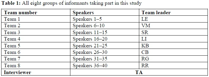 As the above table indicates, each group of informants had a team leader who was responsible for liaising with the interviewer regarding the time and venue of meetings. Spanning a period of roughly six months, a total of between 14 to 20 hours of data per group were collected, yielding an overall spoken corpus of about 150 hours. Multiparty conversations were preferred because they allow informants the safety of interacting within a circle of close friends and the additional bonus of being able to contribute to the analysis carried out by the researcher.