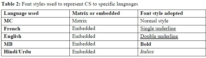 The following subsections provide an insight into the ways in which CS and the insertion of sequences of swear words are creatively embedded into the routine face-to-face interactions of the informants taking part in this study. For ease of reference, the following table presents a summary of the different font styles associated with each language operating in the current multilingual matrix: