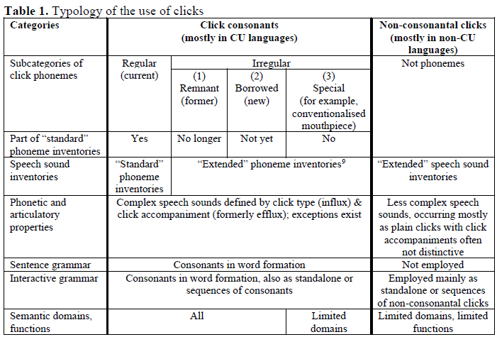 8 Individual click-containing words have, however, been borrowed by a few non-CU languages through contact with CU languages. See discussion in Section 2.2.