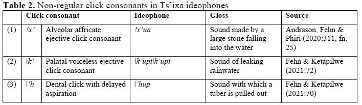 The origin of non-regular click phonemes is not always transparent, as seen in the following examples from Ts'ixa and Namibian Shiyeyi. For Ts'ixa, a Kalahari Khoe language, Andrason, Fehn and Phiri (2020) and Fehn and Ketapilwe (2021) provide examples of words with both remnant and borrowed click consonants, see Table 2.