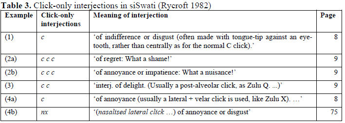 While example (1) is a non-consonantal click, all other interjections in Table 3 employ either regular or borrowed click consonants. For the two interjections (2a) and (2b) rendered (c c c), no information on the actual pronunciation has been provided by Rycroft (1982:9). Based on their spelling, one may assume that these sequences are three regular voiceless dental click consonants, and even though they cannot in their current form be joined with non-click phonemes to form words, voiceless dental click consonants are part of the phoneme inventory and are therefore regular click consonants in siSwati.