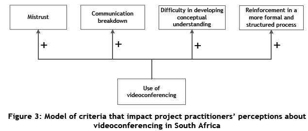 The model suggests that using videoconferencing would cause a decrease in the frequency of communication. It is proposed that when people are not close enough to one another to be able to communicate face-to-face, the frequency of communication decreases. The decrease in communication frequency would result in an increase in both mistrust and communication breakdowns, and this would in turn result in a reduction in cohesiveness (interconnectedness/unity). Bond-Barnard et al. [21] provide a possible solution to this problem; they show that, by making use of a project call centre to facilitate and manage communication between stakeholders, the communication, collaboration, and trust improves.
