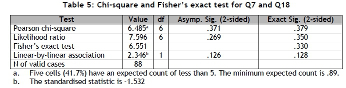 To investigate H30 and H31, the frequencies from Question 7 were cross-tabulated with the frequencies from Question 18. The Pearson chi-square test was then used to test the null hypothesis at the five per cent level of significance; these results are presented in Table 5.
