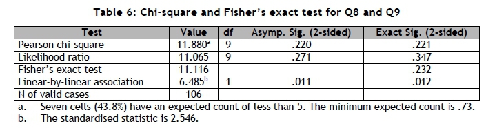 To investigate H40 and H41, the results from Question 8 were cross-tabulated with the results from Question 9. The Pearson chi-square test was then used to test the null hypothesis at the five per cent level of significance; these results are presented in Table 6.