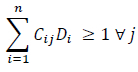 ensures that a POI is covered only when a bus stop is both available (Cij = 1) and selected (Di = 1).