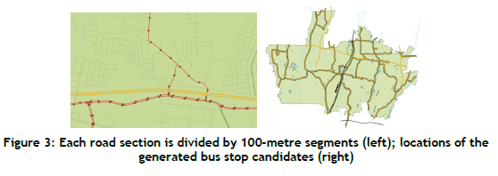 1. Road network constraints: The feasibility of placing bus stops was significantly influenced by the road hierarchy and accessibility. Certain areas lacked appropriate road infrastructure, such as primary or secondary roads, limiting the number of potential locations for stops.