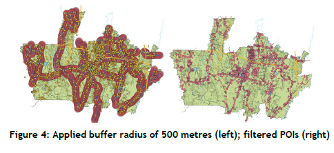4. Buffering and spatial filtering: A 500-metre buffer was applied around candidate bus stops to identify and filter only accessible PQIs (Figure 4), following national transport policies.