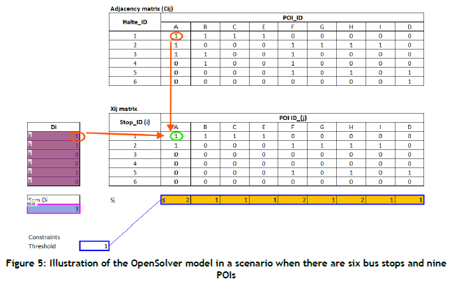 The model was implemented using OpenSolver in Excel, with the COIN-OR CBC (branch-and-cut) linear solver engine. The adjacency matrix (Cij) and decision variables (Di) were shown as matrices in Excel (Figure 5). Since CBC is an exact optimisation solver based on branch-and-cut algorithms, OpenSolver in this implementation used an exact method to identify the optimal combination of stops that satisfied the coverage constraints.